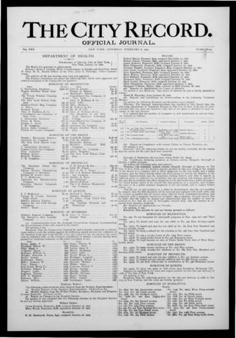 The City Record newspaper publishes notices which includes but is not limited to: public hearings and meetings, public auctions and sales, solicitations and awards and official rules proposed and adopted by city agencies. This is the City Record Newspaper for February 08, 1902.