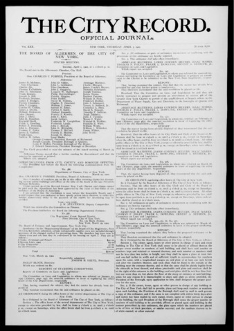 The City Record newspaper publishes notices which includes but is not limited to: public hearings and meetings, public auctions and sales, solicitations and awards and official rules proposed and adopted by city agencies. This is the City Record Newspaper for April 03, 1902.