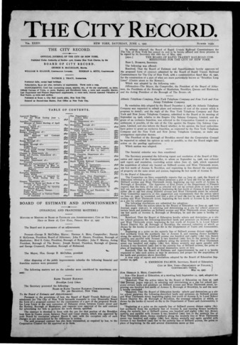 The City Record newspaper publishes notices which includes but is not limited to: public hearings and meetings, public auctions and sales, solicitations and awards and official rules proposed and adopted by city agencies. This is the City Record Newspaper for June 01, 1907.