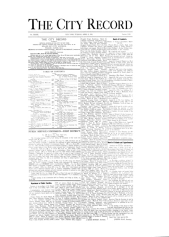 The City Record newspaper publishes notices which includes but is not limited to: public hearings and meetings, public auctions and sales, solicitations and awards and official rules proposed and adopted by city agencies. This is the City Record Newspaper for April 11, 1911.
