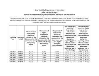 Pursuant to Local Law 121 of 2016, the Department of Correction is required to provide a report regarding mentally ill incarcerated individuals and recidivism. The report provides data related to discharges and recidivism and compares current data with previous data.