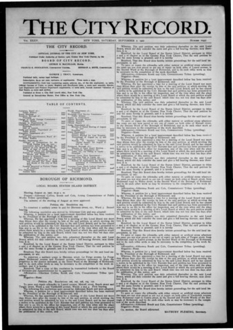 The City Record newspaper publishes notices which includes but is not limited to: public hearings and meetings, public auctions and sales, solicitations and awards and official rules proposed and adopted by city agencies. This is the City Record Newspaper for September 07, 1907.