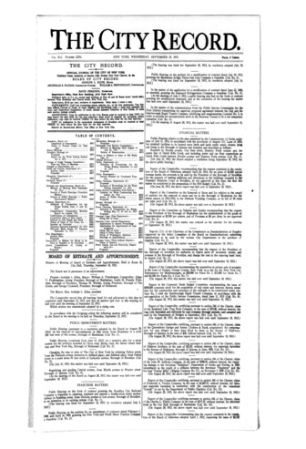 The City Record newspaper publishes notices which includes but is not limited to: public hearings and meetings, public auctions and sales, solicitations and awards and official rules proposed and adopted by city agencies. This is the City Record Newspaper for September 24, 1913.