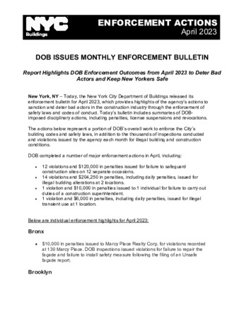 DOB releases Enforcement Bulletins each month that highlight the Agency's actions to sanction and deter bad actors in the construction industry through the enforcement of safety laws and codes of conduct for construction professionals.