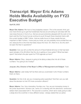 Transcript: Mayor Eric Adams Holds Media Availability on FY23 Executive Budget