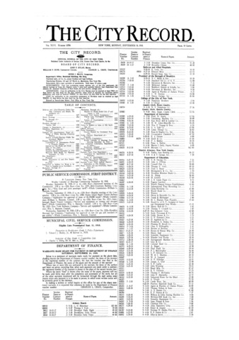 The City Record newspaper publishes notices which includes but is not limited to: public hearings and meetings, public auctions and sales, solicitations and awards and official rules proposed and adopted by city agencies. This is the City Record Newspaper for September 16, 1918.