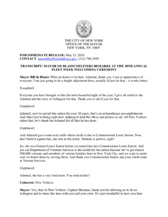Press Release: TRANSCRIPT: MAYOR DE BLASIO DELIVERS REMARKS AT THE 30TH ANNUAL FLEET WEEK WELCOMING CEREMONY