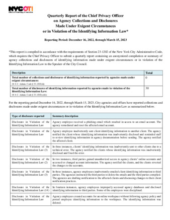Chief Privacy Officer Quarterly Report on Agency Collections or Disclosures Under Exigent Circumstances or in Violation of Identifying Information Law