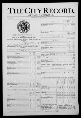 The City Record newspaper publishes notices which includes but is not limited to: public hearings and meetings, public auctions and sales, solicitations and awards and official rules proposed and adopted by city agencies. This is the City Record Newspaper for August 21, 1899.