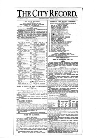 The City Record newspaper publishes notices which includes but is not limited to: public hearings and meetings, public auctions and sales, solicitations and awards and official rules proposed and adopted by city agencies. This is the City Record Newspaper for December 12, 1914 with supplement.