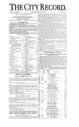 The City Record newspaper publishes notices which includes but is not limited to: public hearings and meetings, public auctions and sales, solicitations and awards and official rules proposed and adopted by city agencies. This is the City Record Newspaper for June 21, 1915.