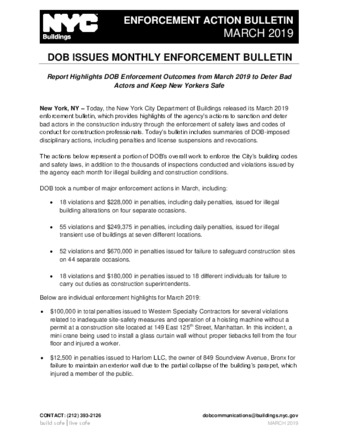 DOB releases Enforcement Bulletins each month that highlight the Agency's actions to sanction and deter bad actors in the construction industry through the enforcement of safety laws and codes of conduct for construction professionals.