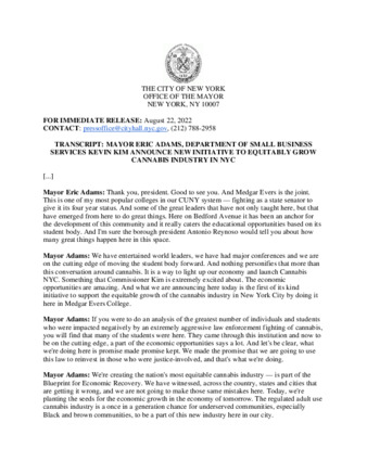 TRANSCRIPT: MAYOR ERIC ADAMS, DEPARTMENT OF SMALL BUSINESS SERVICES KEVIN KIM ANNOUNCE NEW INITIATIVE TO EQUITABLY GROW CANNABIS INDUSTRY IN NYC