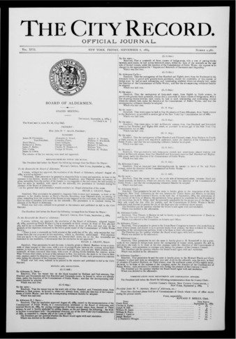 The City Record newspaper publishes notices which includes but is not limited to: public hearings and meetings, public auctions and sales, solicitations and awards and official rules proposed and adopted by city agencies. This is the City Record Newspaper for September 06, 1889.