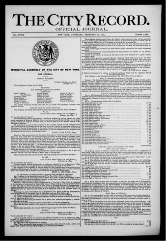 The City Record newspaper publishes notices which includes but is not limited to: public hearings and meetings, public auctions and sales, solicitations and awards and official rules proposed and adopted by city agencies. This is the City Record Newspaper for February 16, 1899.