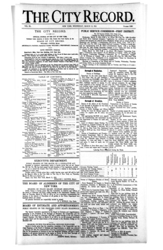 The City Record newspaper publishes notices which includes but is not limited to: public hearings and meetings, public auctions and sales, solicitations and awards and official rules proposed and adopted by city agencies. This is the City Record Newspaper for March 13, 1912.