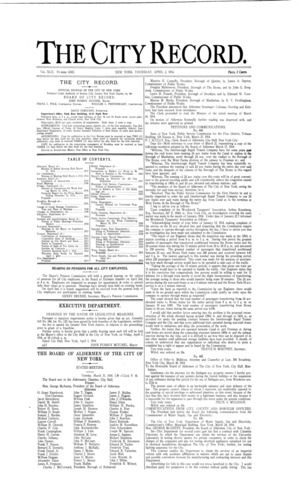 The City Record newspaper publishes notices which includes but is not limited to: public hearings and meetings, public auctions and sales, solicitations and awards and official rules proposed and adopted by city agencies. This is the City Record Newspaper for April 02, 1914.