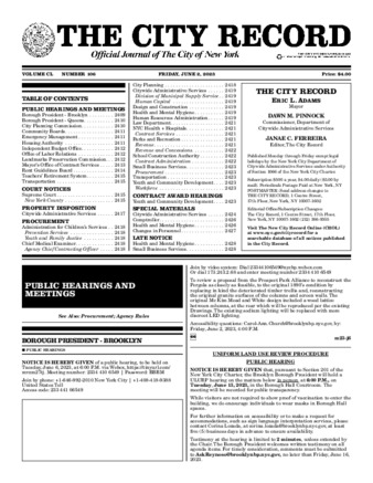 The City Record newspaper publishes notices which includes but is not limited to public hearings and meetings, public auctions and sales, solicitations and awards and official rules proposed and adopted by city agencies.