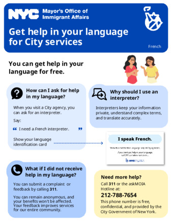 Flyer informing community members of their language access rights within New York City, directing them to call 311 or the MOIA hotline for more information.