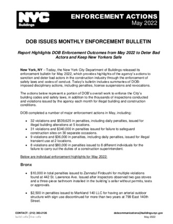 DOB releases Enforcement Bulletins each month that highlight the Agency's actions to sanction and deter bad actors in the construction industry through the enforcement of safety laws and codes of conduct for construction professionals.
