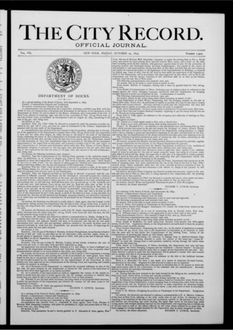 The City Record newspaper publishes notices which includes but is not limited to: public hearings and meetings, public auctions and sales, solicitations and awards and official rules proposed and adopted by city agencies. This is the City Record Newspaper for October 24, 1879.