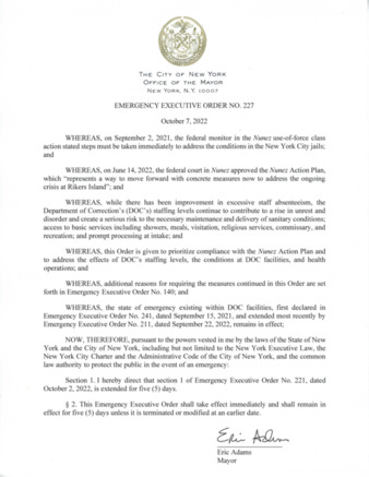 Emergency Executive Order No. 227, extends Emergency Executive Order No. 221, dated October 2, 2022, for five (5) days, if this relates to Rikers.