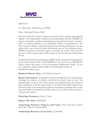A quantitative report submitted by the commissioner detailing the number of vehicles contracted as school buses to meet the transportation needs of the school system and demonstrating the extent of their compliance with the requirements to be fitted with diesel engines that meet the goals of pre-determined pollution standards, including data on the age and crankcase ventilation retrofit status of every school bus pursuant to a school bus contract