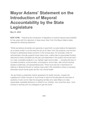 New York City Mayor Adams releases a statement following the introduction of legislation to extend mayoral accountability for two years with the reduction of class sizes.