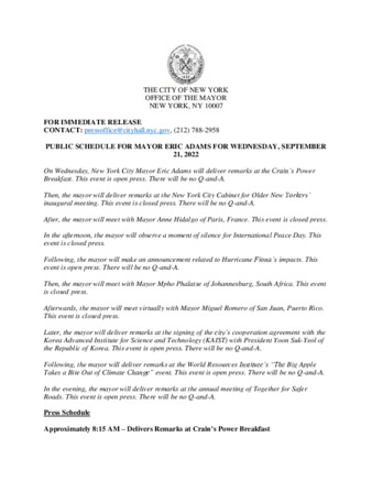 PUBLIC SCHEDULE FOR MAYOR ERIC ADAMS FOR WEDNESDAY, SEPTEMBER 21, 2022