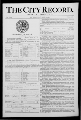 The City Record newspaper publishes notices which includes but is not limited to: public hearings and meetings, public auctions and sales, solicitations and awards and official rules proposed and adopted by city agencies. This is the City Record Newspaper for April 18, 1899.