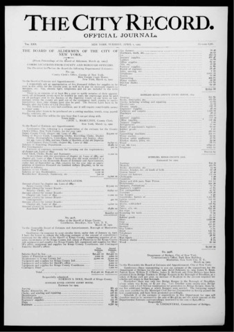 The City Record newspaper publishes notices which includes but is not limited to: public hearings and meetings, public auctions and sales, solicitations and awards and official rules proposed and adopted by city agencies. This is the City Record Newspaper for April 01, 1902.