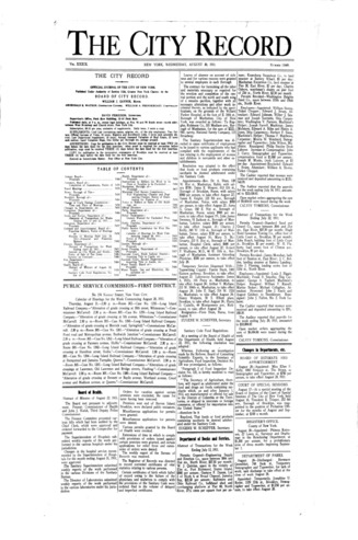 The City Record newspaper publishes notices which includes but is not limited to: public hearings and meetings, public auctions and sales, solicitations and awards and official rules proposed and adopted by city agencies. This is the City Record Newspaper for August 30, 1911.