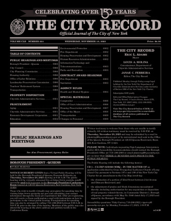 The City Record newspaper publishes notices which includes but is not limited to public hearings and meetings, public auctions and sales, solicitations and awards and official rules proposed and adopted by city agencies.