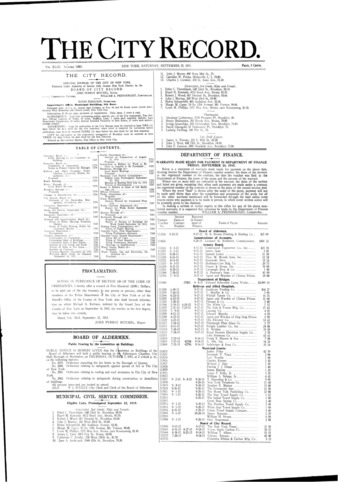 The City Record newspaper publishes notices which includes but is not limited to: public hearings and meetings, public auctions and sales, solicitations and awards and official rules proposed and adopted by city agencies. This is the City Record Newspaper for September 25, 1915.