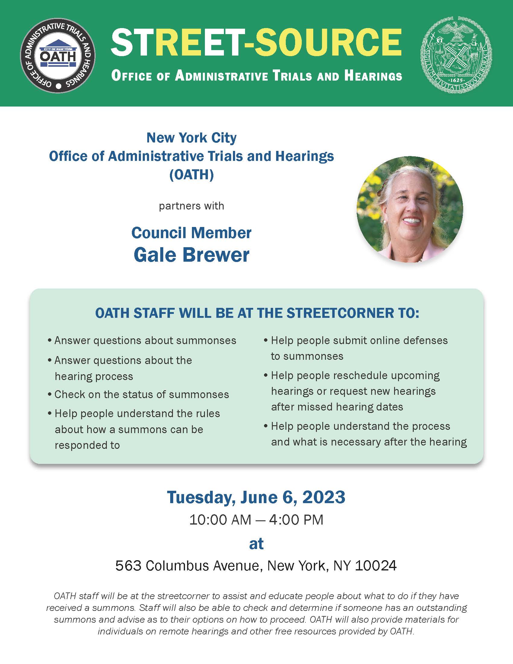 OATH staff were at the street corner to assist and educate people about what to do should they have received a summons and to check to determine if someone has an outstanding summons. Materials about remote hearings and other free resources were provided to the public as well.