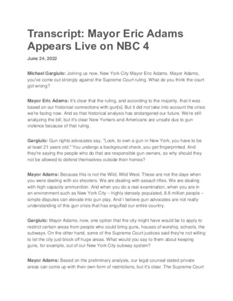 A transcript about New York City Mayor Eric Adams appearing live on NBC 4 discussing the Supreme Court ruling regarding New York State Rifle & Pistol Association Inc. v. Bruen