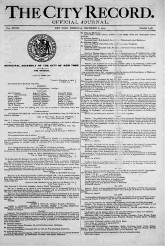 The City Record newspaper publishes notices which includes but is not limited to: public hearings and meetings, public auctions and sales, solicitations and awards and official rules proposed and adopted by city agencies. This is the City Record Newspaper for December 06, 1900.