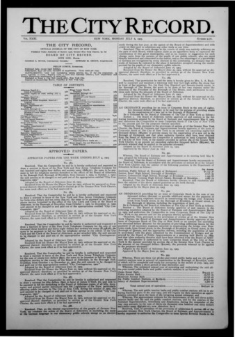 The City Record newspaper publishes notices which includes but is not limited to: public hearings and meetings, public auctions and sales, solicitations and awards and official rules proposed and adopted by city agencies. This is the City Record Newspaper for July 04, 1903.