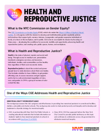 The Health & Reproductive Justice one-pager provides an overview on CGE, health, and reproductive justice. On the back of the one-pager there are a variety of city agency resources related to health insurance, different types of medical care, income supports, and people's Healthcare rights.
