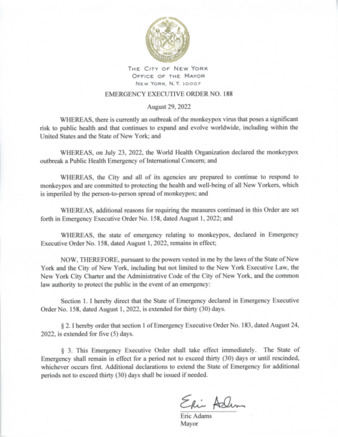 Emergency Executive Order No. 188, extends Emergency Executive Order No. 183, dated August 24, 2022, for five (5) days, if this relates to the monkeypox virus.