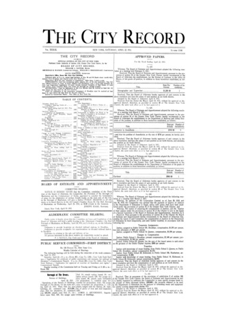 The City Record newspaper publishes notices which includes but is not limited to: public hearings and meetings, public auctions and sales, solicitations and awards and official rules proposed and adopted by city agencies. This is the City Record Newspaper for April 22, 1911.
