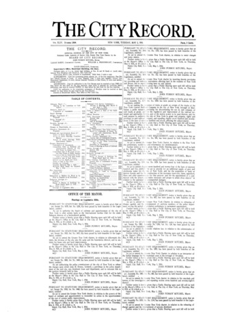 The City Record newspaper publishes notices which includes but is not limited to: public hearings and meetings, public auctions and sales, solicitations and awards and official rules proposed and adopted by city agencies. This is the City Record Newspaper for May 02, 1916.