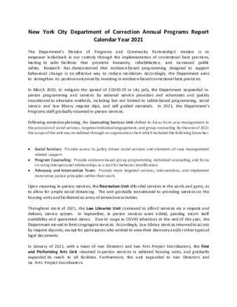 Pursuant to local law, this report provides information and summaries related to programming in city jails, including hard skills training, certifications,and evidence-based programs for participants to engage with social service providers and develop socio-emotional skills.