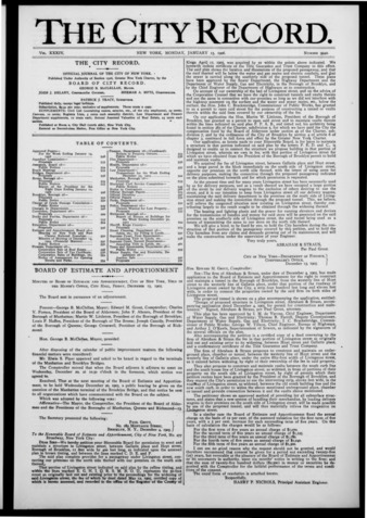 The City Record newspaper publishes notices which includes but is not limited to: public hearings and meetings, public auctions and sales, solicitations and awards and official rules proposed and adopted by city agencies. This is the City Record Newspaper for January 15, 1906.