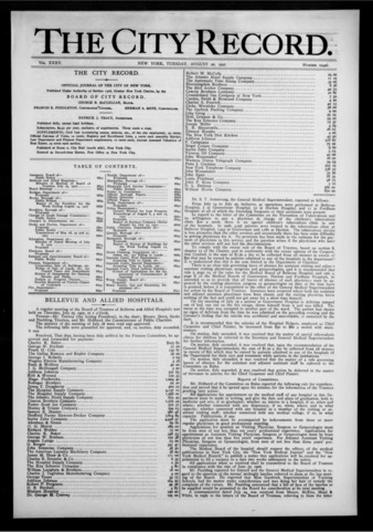 The City Record newspaper publishes notices which includes but is not limited to: public hearings and meetings, public auctions and sales, solicitations and awards and official rules proposed and adopted by city agencies. This is the City Record Newspaper for August 20, 1907.