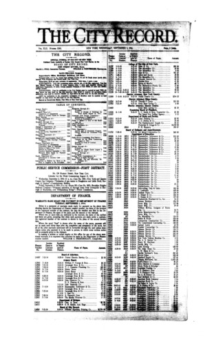 The City Record newspaper publishes notices which includes but is not limited to: public hearings and meetings, public auctions and sales, solicitations and awards and official rules proposed and adopted by city agencies. This is the City Record Newspaper for September 02, 1914.