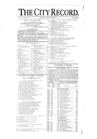 The City Record newspaper publishes notices which includes but is not limited to: public hearings and meetings, public auctions and sales, solicitations and awards and official rules proposed and adopted by city agencies. This is the City Record Newspaper for September 18, 1915.