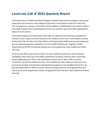 The Supportive and Intensive Crisis Residence Report is submitted pursuant to Local Law 118 of 2023 which relates to establishing crisis respite centers, the Health Department is submitting the first of our quarterly reports of 2026 regarding the status of such centers.