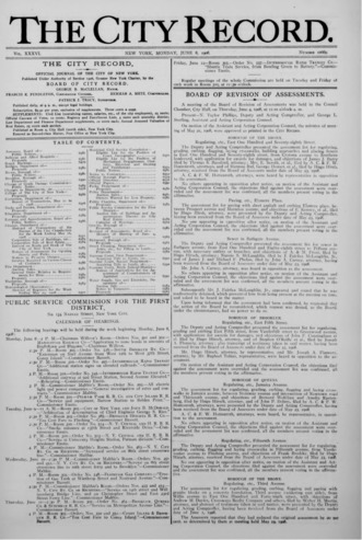 The City Record newspaper publishes notices which includes but is not limited to: public hearings and meetings, public auctions and sales, solicitations and awards and official rules proposed and adopted by city agencies. This is the City Record Newspaper for June 08, 1908.