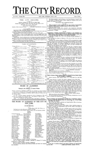 The City Record newspaper publishes notices which includes but is not limited to: public hearings and meetings, public auctions and sales, solicitations and awards and official rules proposed and adopted by city agencies. This is the City Record Newspaper for May 06, 1915.